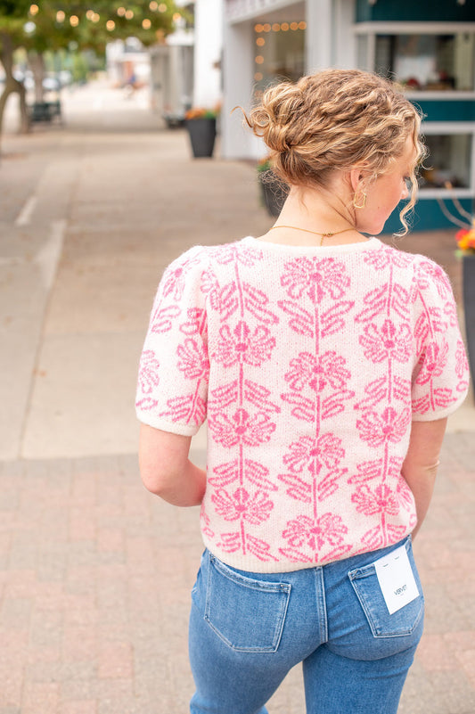 Pink Floral SS Button Cardigan