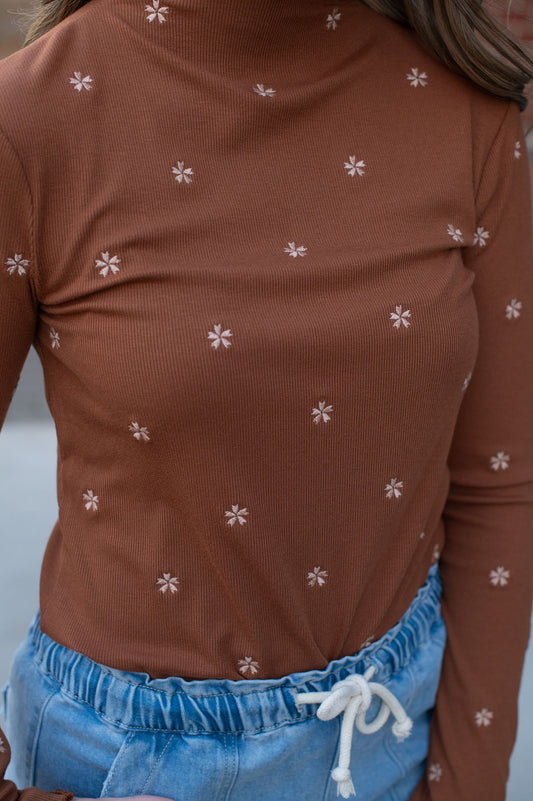 Caramel Floral Embroideried Mock Neck To9p