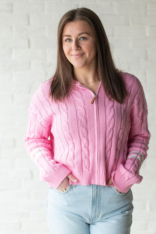 Pink Cable Knit Hooded Zip Up