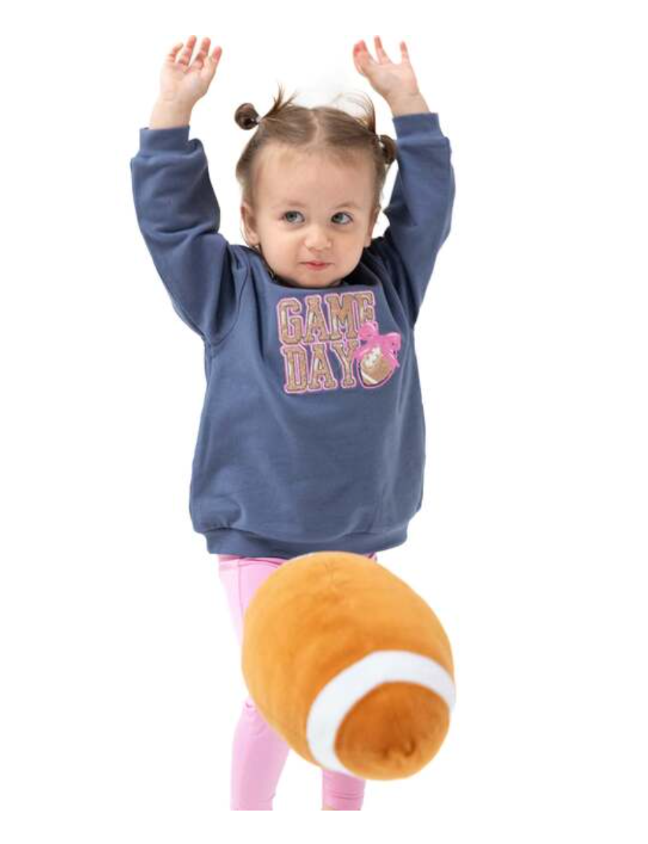 Game Day Ready: Oversized Sweatshirt Get your little one all set for game day vibes and cozy cuddles! Our Oversized Sweatshirt made from soft French Terry features playful ""Game Day"" applique alongside a textured football with bow chenille appliquea perfect blend of sporty spirit and sweet style. The roomy fit keeps your tiny fan warm and comfy from kickoff to cuddle time. Why You’ll Love It: French Terry Fabric: Soft, warm, and ideal for layering Football with Bow Chenille Applique: Sporty meets adorable in a textured design Game Day Applique: Cheer-worthy style for little fans Oversized Fit: Cozy and roomy for all-day comfort and play From tailgate fun to story time snuggles, this sweatshirt scores big on cuteness and comfort!