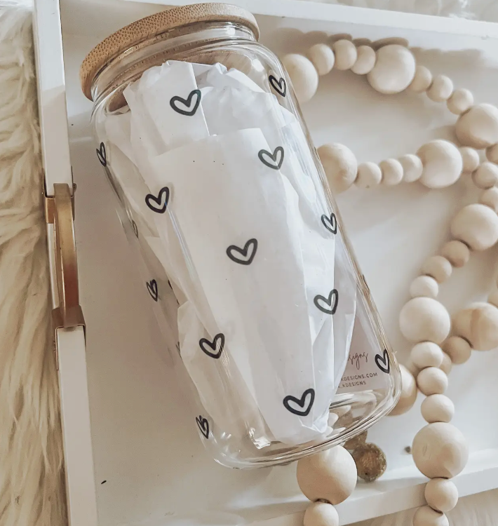 Cute, trendy coquette accessories. 16oz Glass Cup with Bamboo Lid is perfect for iced coffee, smoothies, teas, mocktails and cocktails. - Included with each 16oz can-shaped glass is one bamboo lid with silicone rubber seal and a plastic straw. -Images on glass are not vinyl. They will not peel. -Clear cup has white tissue paper to see design better. - Perfect for any type of beverage! CARING FOR YOUR GLASS: -Not dishwasher safe -Not microwave safe -Gently hand wash glass, straw and bamboo. We recommend you wash the bamboo tops with dish soap and leave them out to dry. To remove odors, soak the top in vinegar. Mix equal parts hot water and vinegar in a bowl, and let the top soak for up to a 20 minutes. Rinse thoroughly with hot water and towel dry. **Please use proper clean and care for your bamboo lids to avoid mold and prolong its life. We are not liable for improper care.