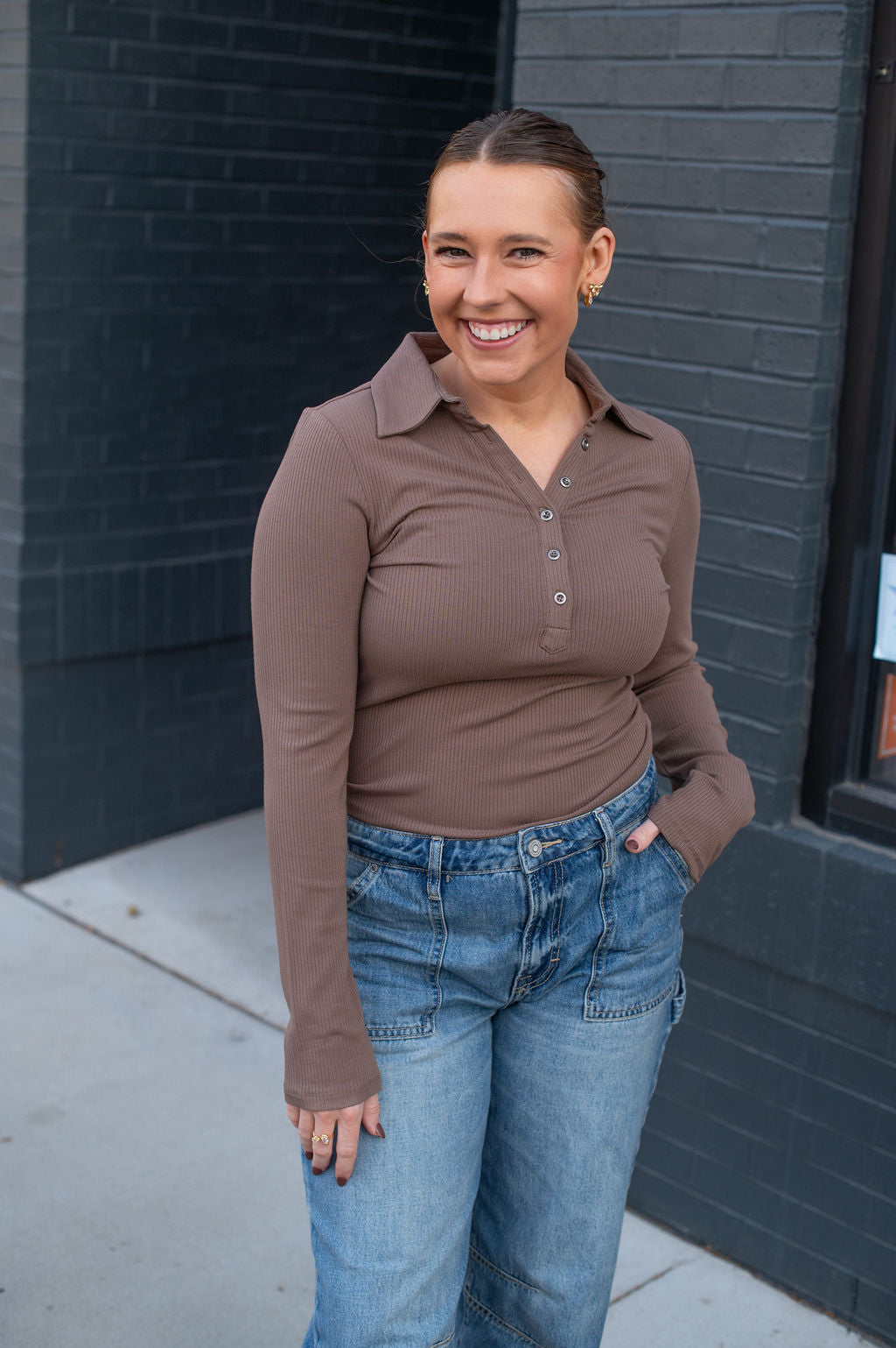 This mocha brown long sleeve blouse is the perfect elevated basic for any wardrobe. Featuring a soft, flattering fit and a few buttons down the chest for a subtle, chic touch. Easy to dress up or down — pair it with jeans for a casual look or layer it under a jacket for a more polished vibe. A timeless, cute essential you’ll reach for again and again